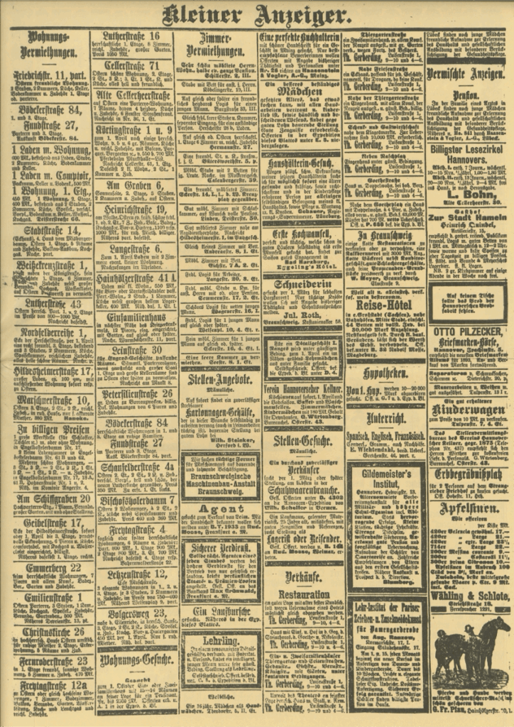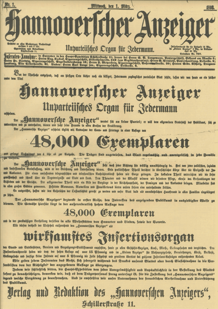 Es war ein Montag vor 132 Jahren. Genauer gesagt war es Montag, der 01.03.1893. In Hannover erscheint an diesem Tag das erste Mal der Hannoversche Anzeiger, heute die Hannoversche Allgemeine Zeitung, um vier Uhr morgens. In 48.000 Exemplaren auf jeweils 16 Seiten können die Hannoveraner von 1893 kostenlos redaktionelle Beiträge und Anzeigen lesen. Im “kleinen Anzeiger” finden sich Wohnungs-, Zimmer-, Stellenanzeigen und weitere Angebote. Für 5 Pfennig pro Zeile konnten hier Geschäfte und Privatpersonen ein Inserat buchen. Dafür musste ein “Jedermann” sich nur in der Schillerstraße 11 melden. Am 01.03.1893 wurden Stellenangebote im Hannoverschen Anzeiger inseriert. Damals waren die Stellenangebote noch Männlein oder Weiblein ausgeschrieben. So suchte die Braunschweigische Maschinenbauanstalt an diesem Tage nach einem “tüchtigen Herren für die Vertretungsgeschäfte und laufende Beschäftigungen.” Ein Kartonnagen-Geschäft “sucht sofort einen zuverlässigen Arbeiter für die Herstellung. Kenntnisse im Ausschneiden, Formen und Zusammenkleben sind erwünscht. Gute Bezahlung.“ Auch die Mädchen waren gefragt. Vogler & Co., aus Hamburg benötigten “eine perfekte Buchhalterin mit sicherer Handschrift für ein größeres Geschäft […]. Erfahrung in doppelter Buchführung erforderlich.” Das waren aber längst noch nicht alle. Insgesamt zwölf Stellenangebote waren an diesem Tag inseriert. Schau doch mal selbst: